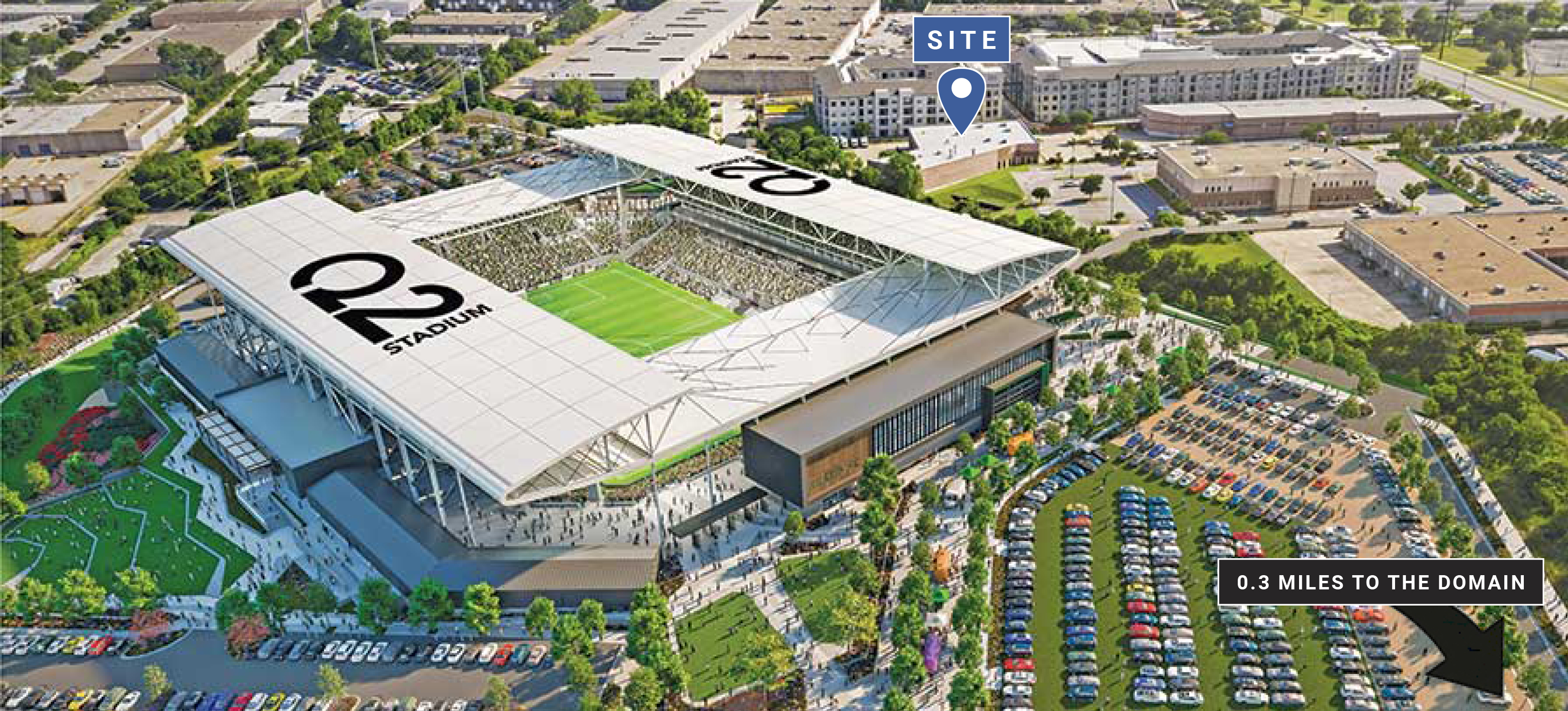 Industrial warehouse for lease located adjacent to Q2’s Austin FC soccer stadium and a short walk to The Domain.